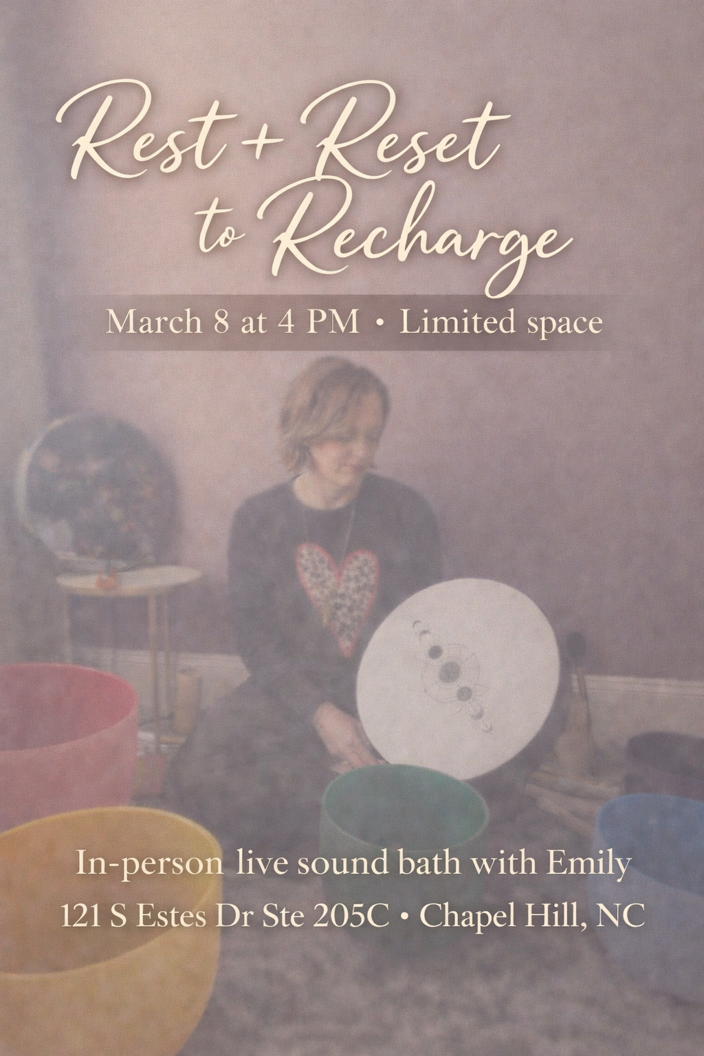 An hour of guided rest, gentle sound, and space to slow down — no experience required.